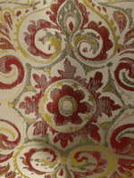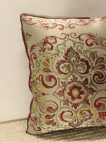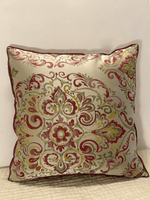 The Sutradhar 03 Cushion Cover captures the essence of heritage design with its ornate woven jacquard fabric and rich interplay of color and texture. A centrally placed damask medallion detailed with scrollwork and floral elements in hues of deep red, rust, gold, and sage green adds an air of traditional grandeur against a soft, light-toned base.