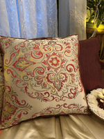 Finished with a pink textured back and concealed zipper, this cushion brings regal warmth to any interior, perfect for lovers of traditional, maximalist, or festive décor.