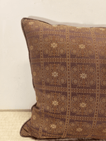 The Sutradhar 05 Cushion Cover draws inspiration from Eastern artistry and architectural motifs. Crafted from rich woven jacquard fabric, it features a geometric grid pattern interlaced with intricate gold medallion and quatrefoil motifs, beautifully contrasted against a deep purple satin base.